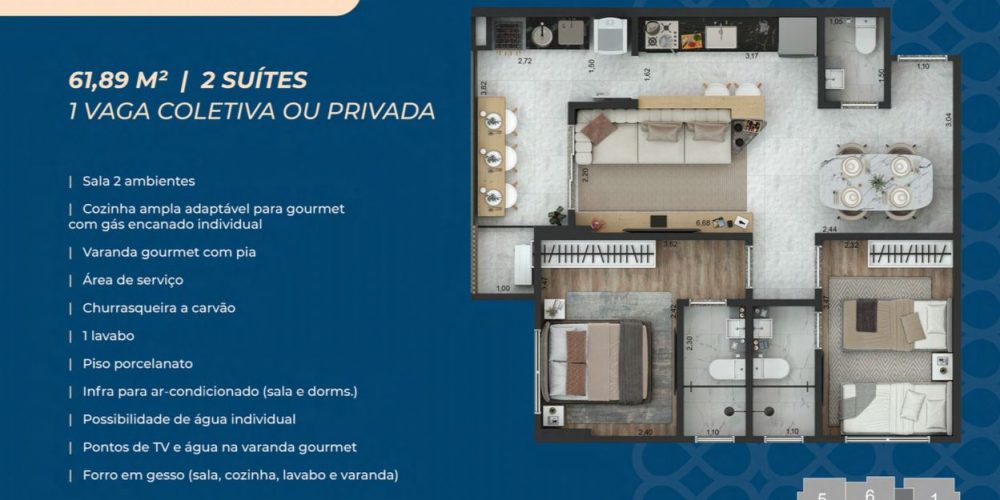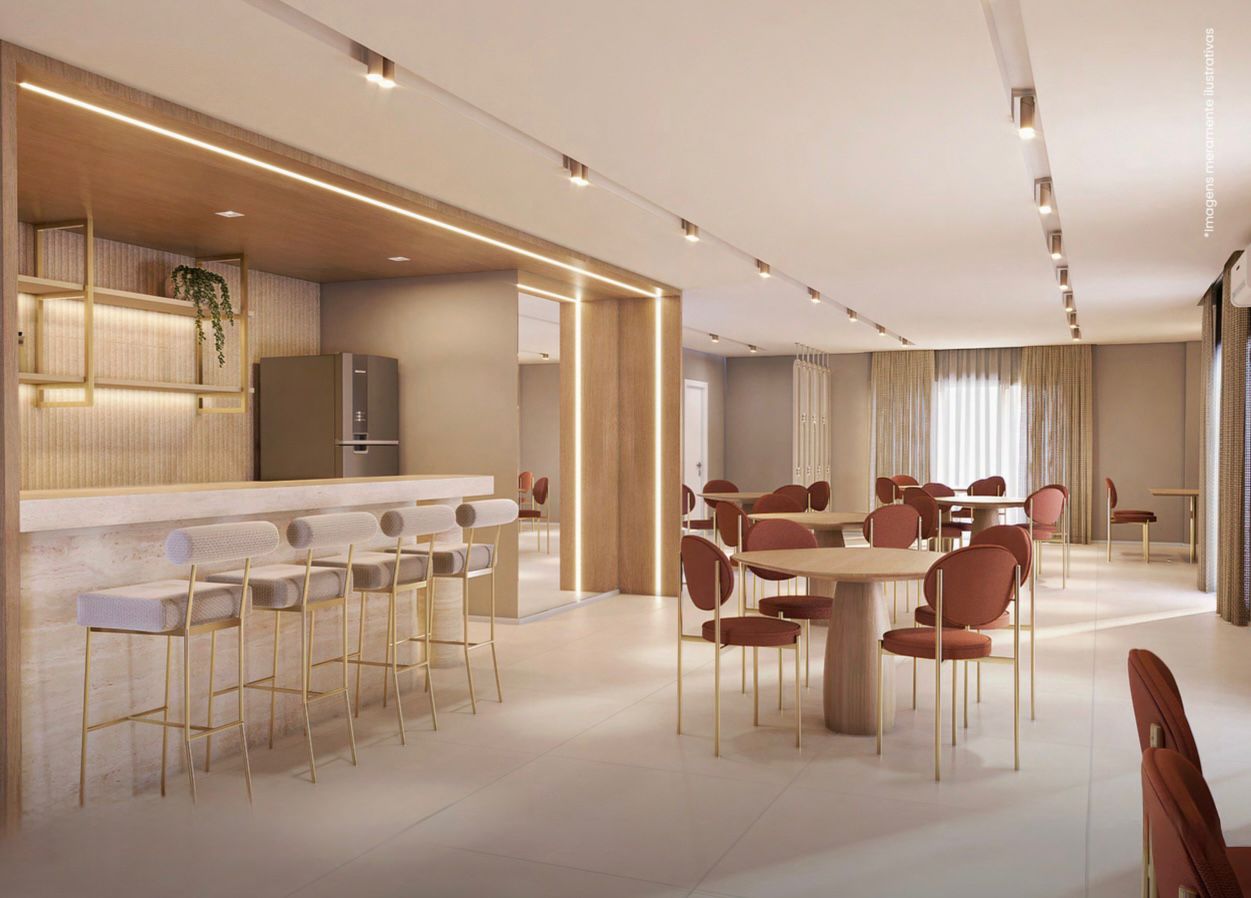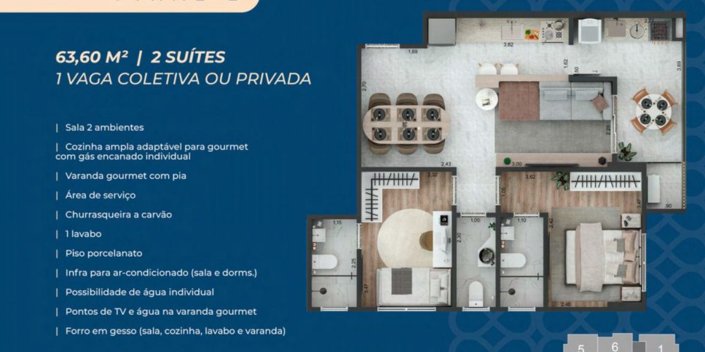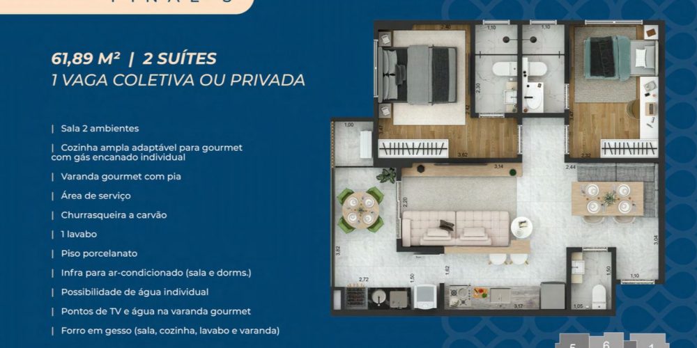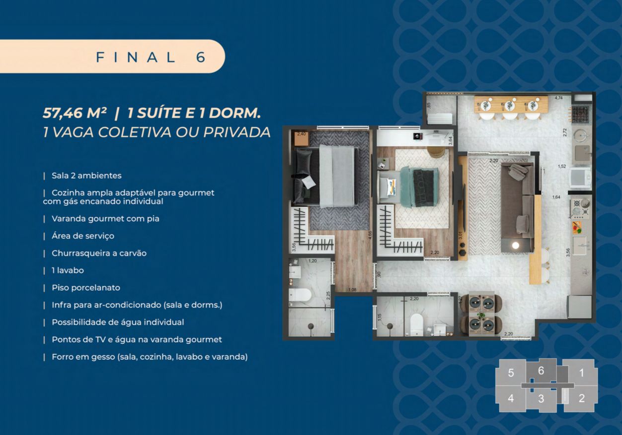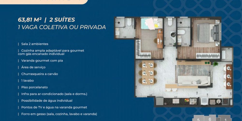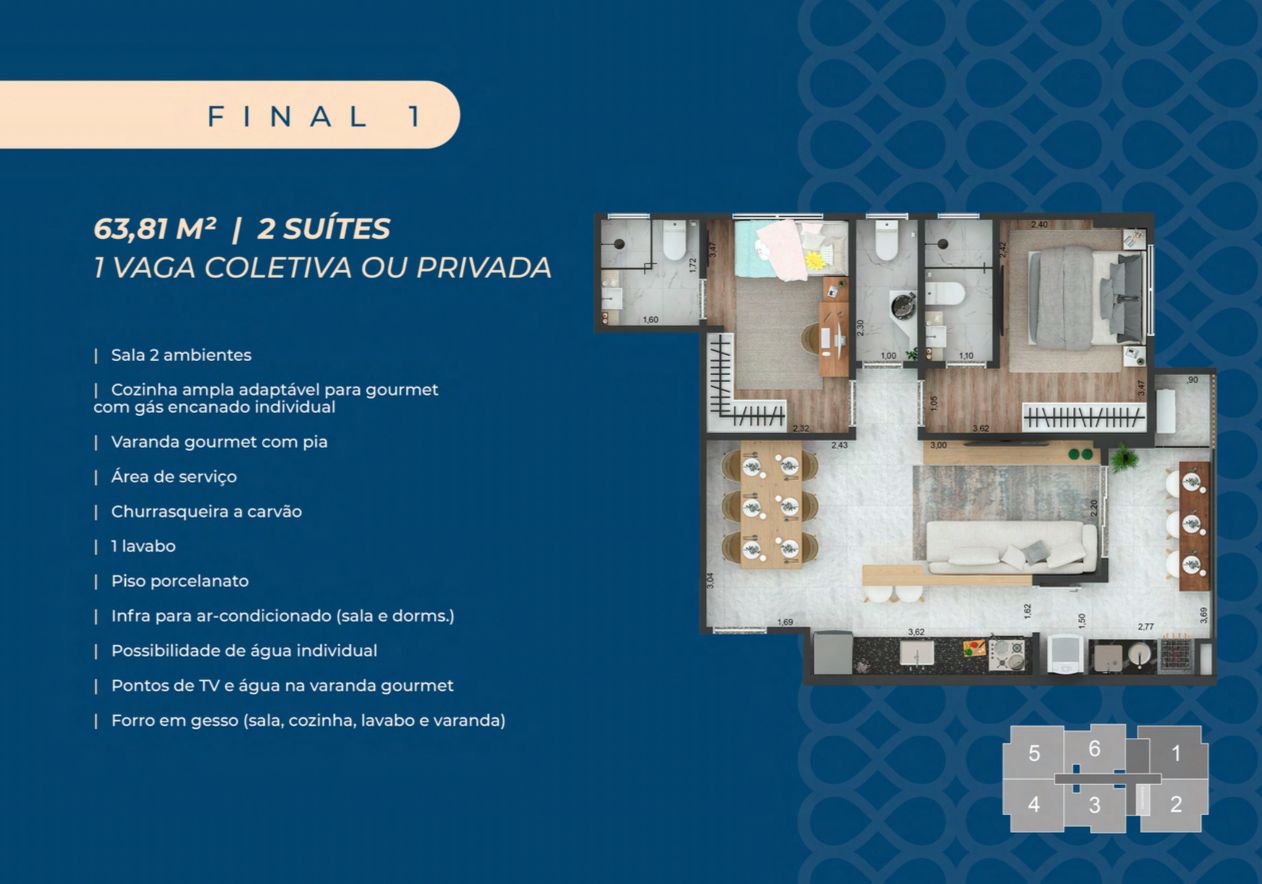 Apartamentos de 2 dormitórios, de 57 a 63 m², com 1 vaga de garagem.