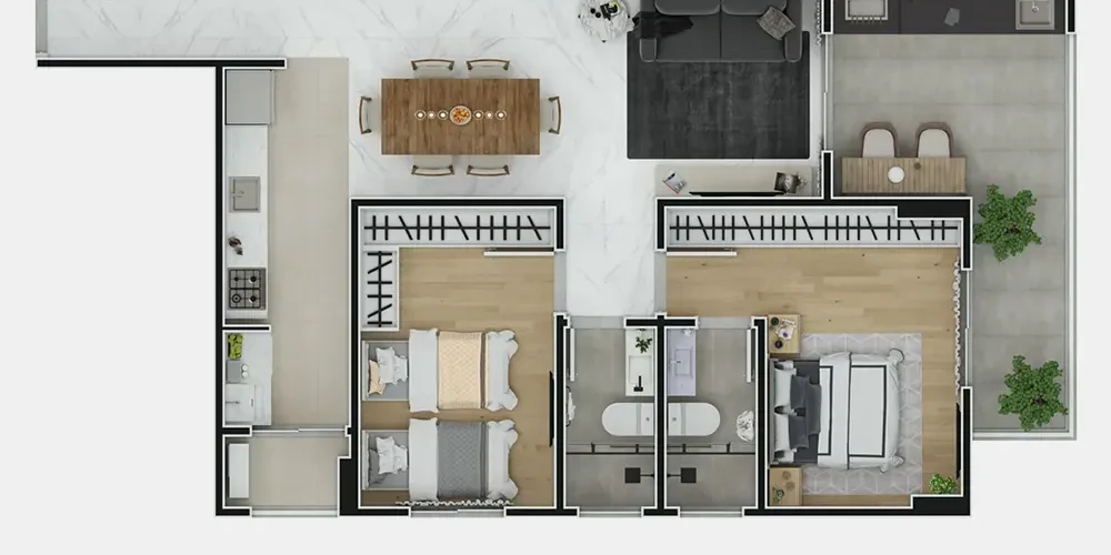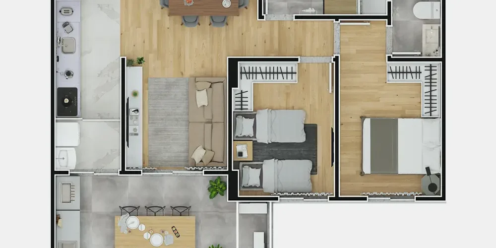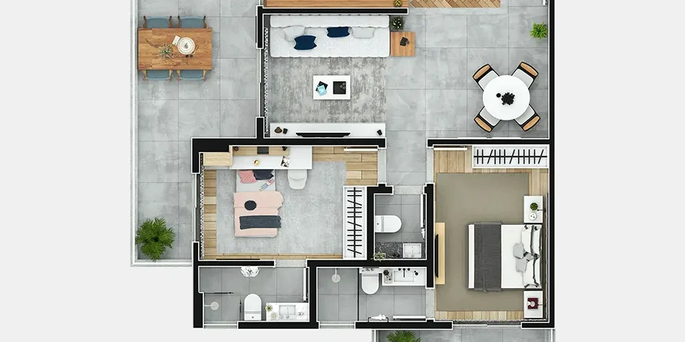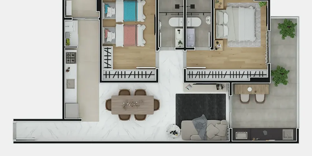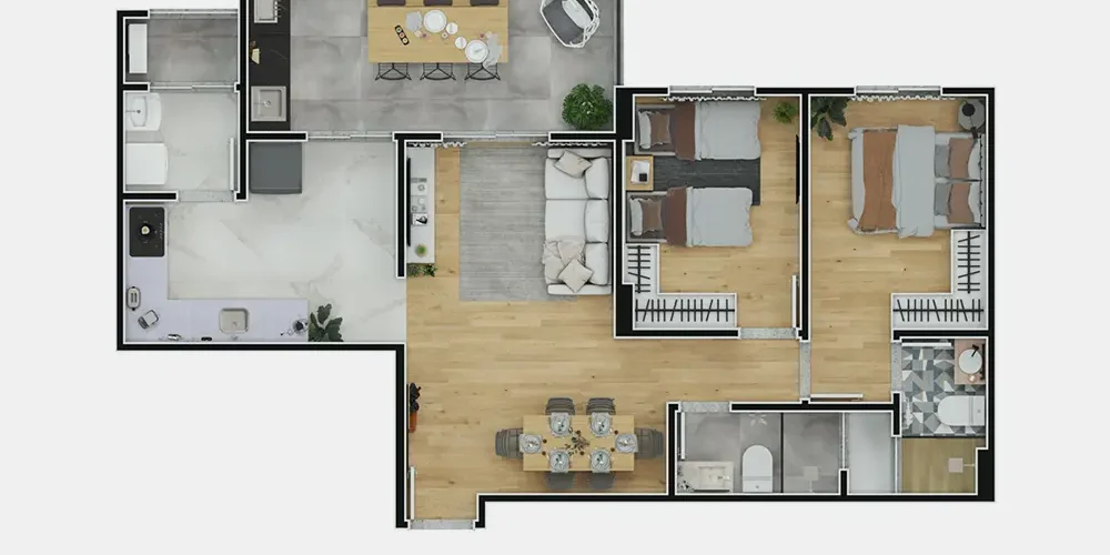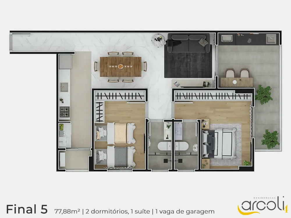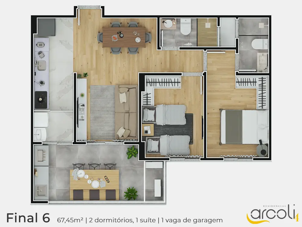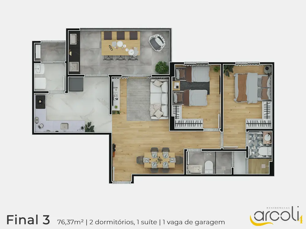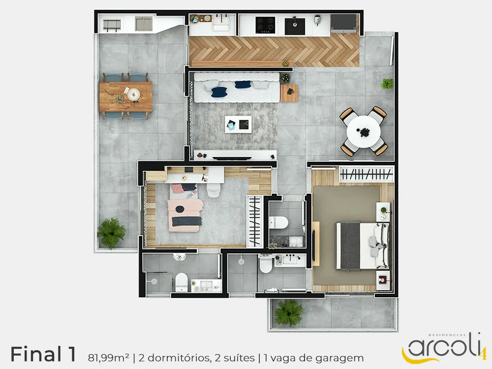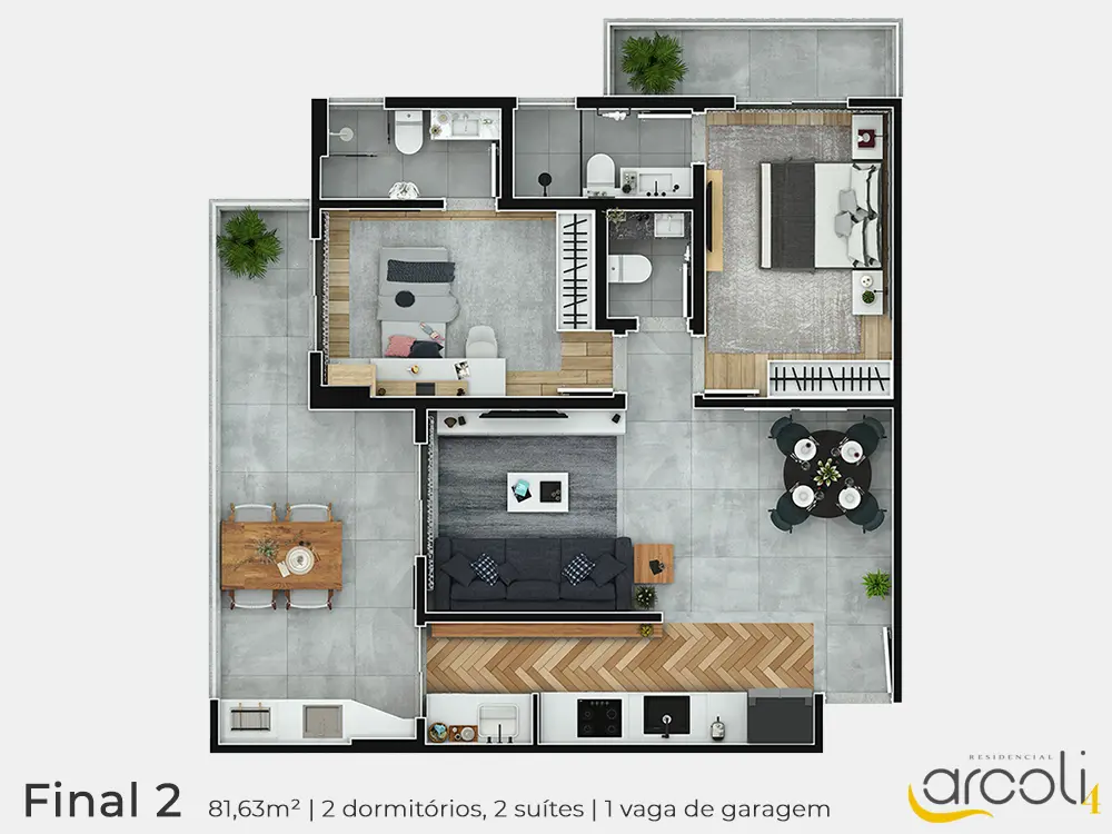 Apartamentos de 2 dormitórios, com 1 ou 2 suítes, de 67 a 81 m², com 1 vaga de garagem.