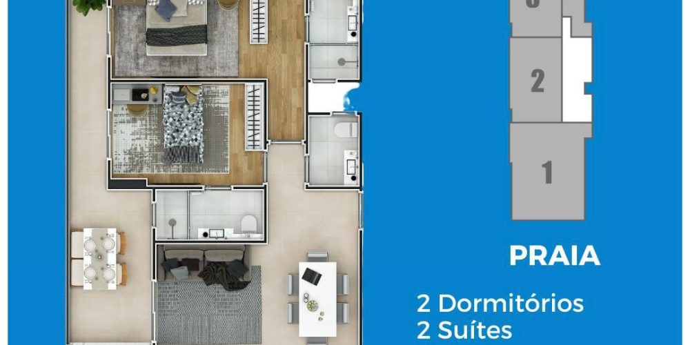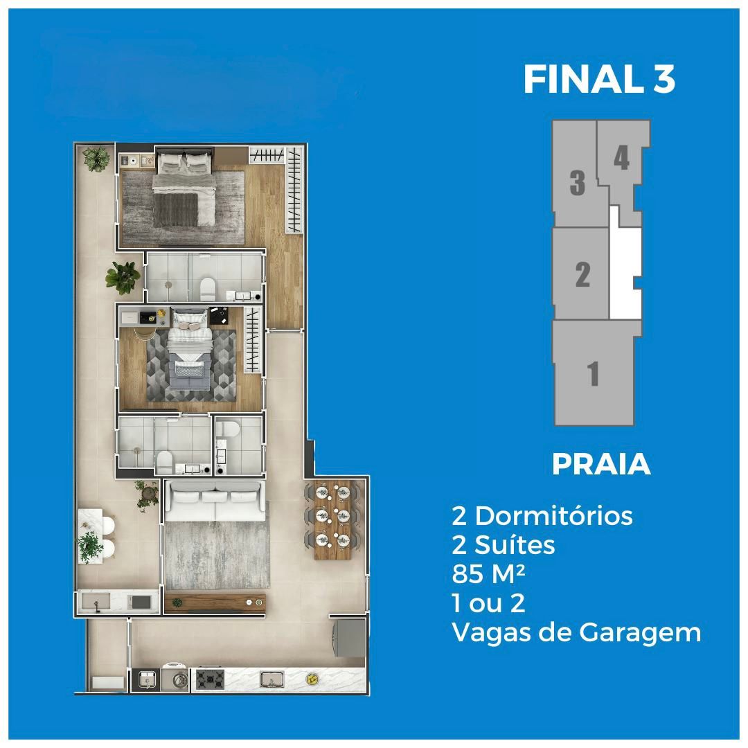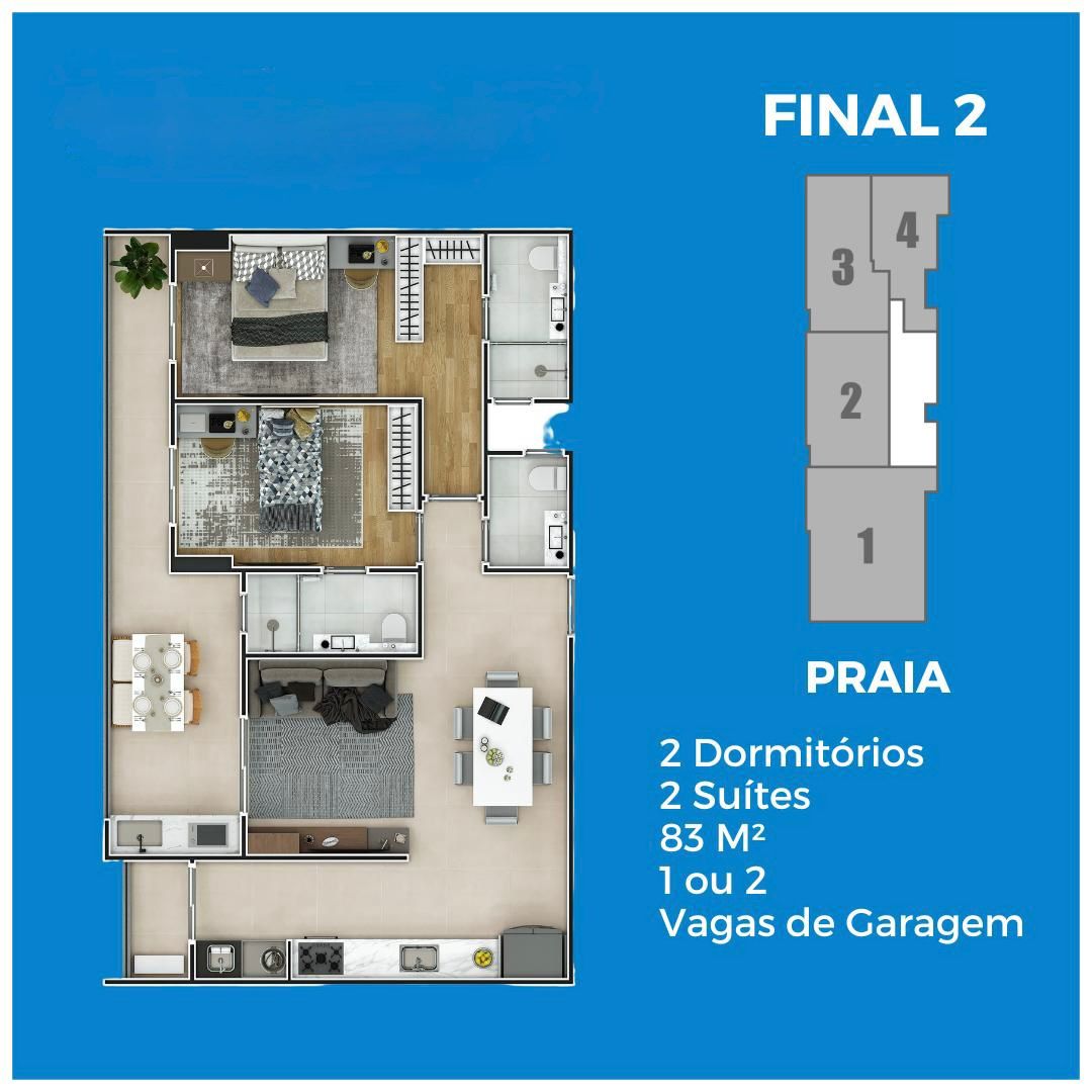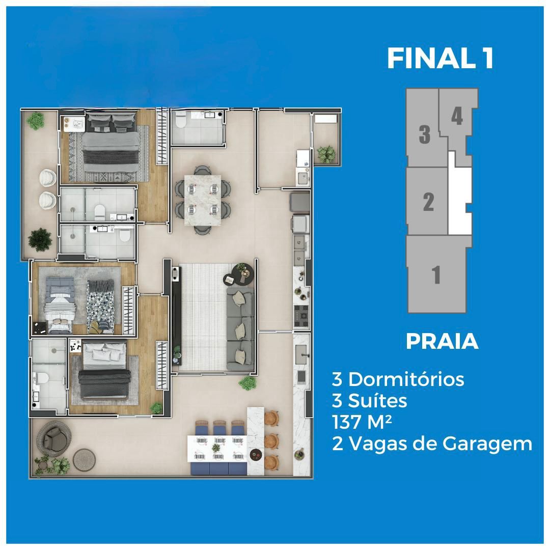 Apartamentos Frente Mar de 1, 2 e 3 dormitórios, de 65 a 136 m², com 1 ou 2 vagas de garagem.