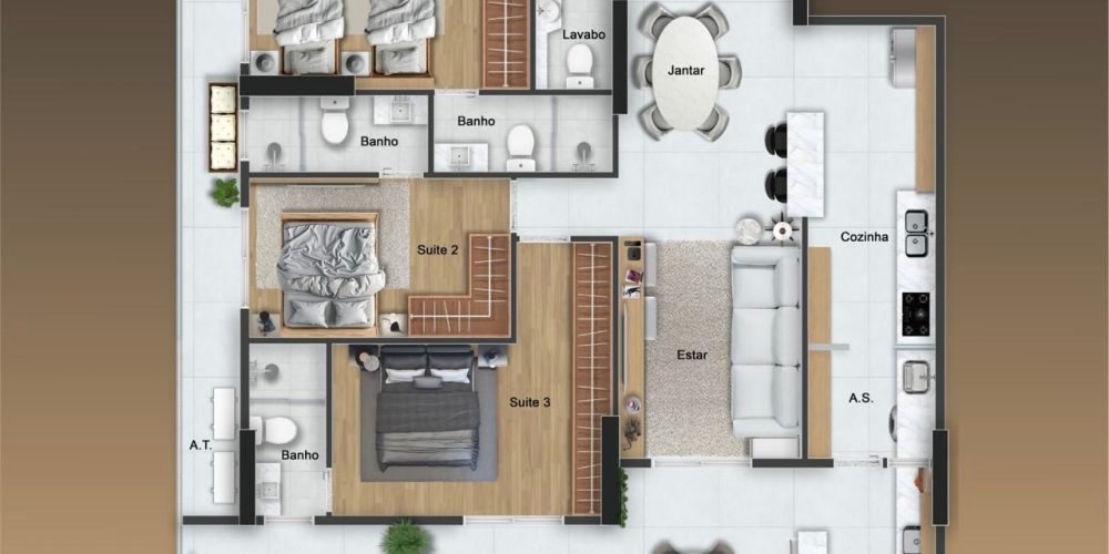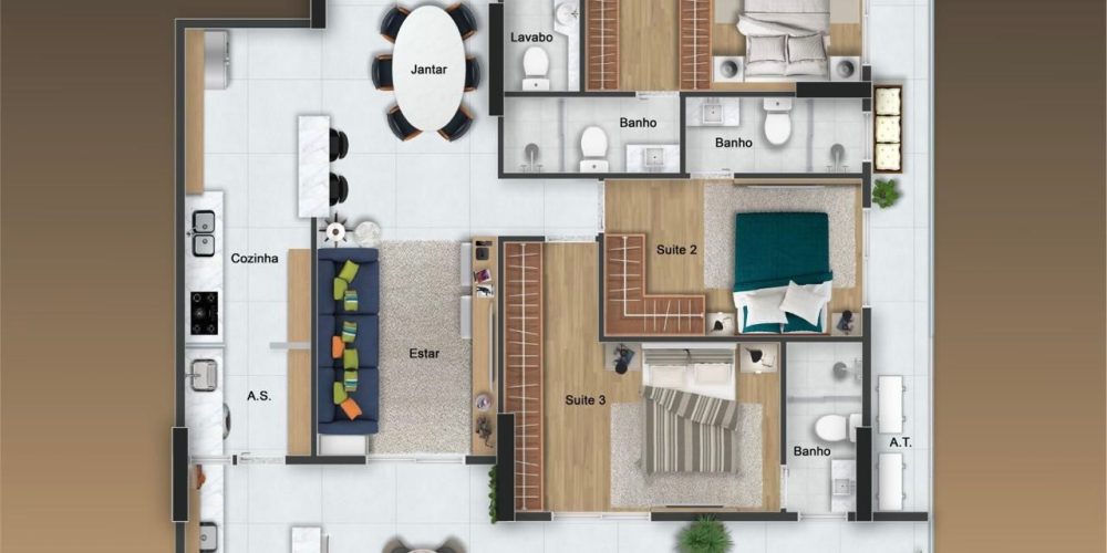 Apartamentos de 3 dormitórios, de 127 a 134 m², com 2 vagas privativas.