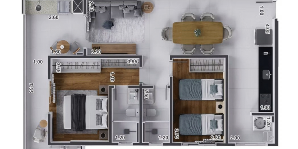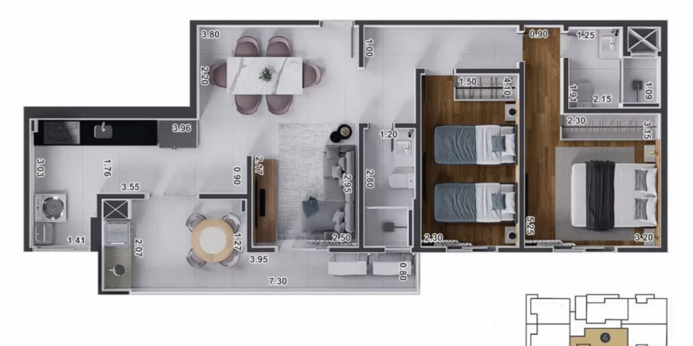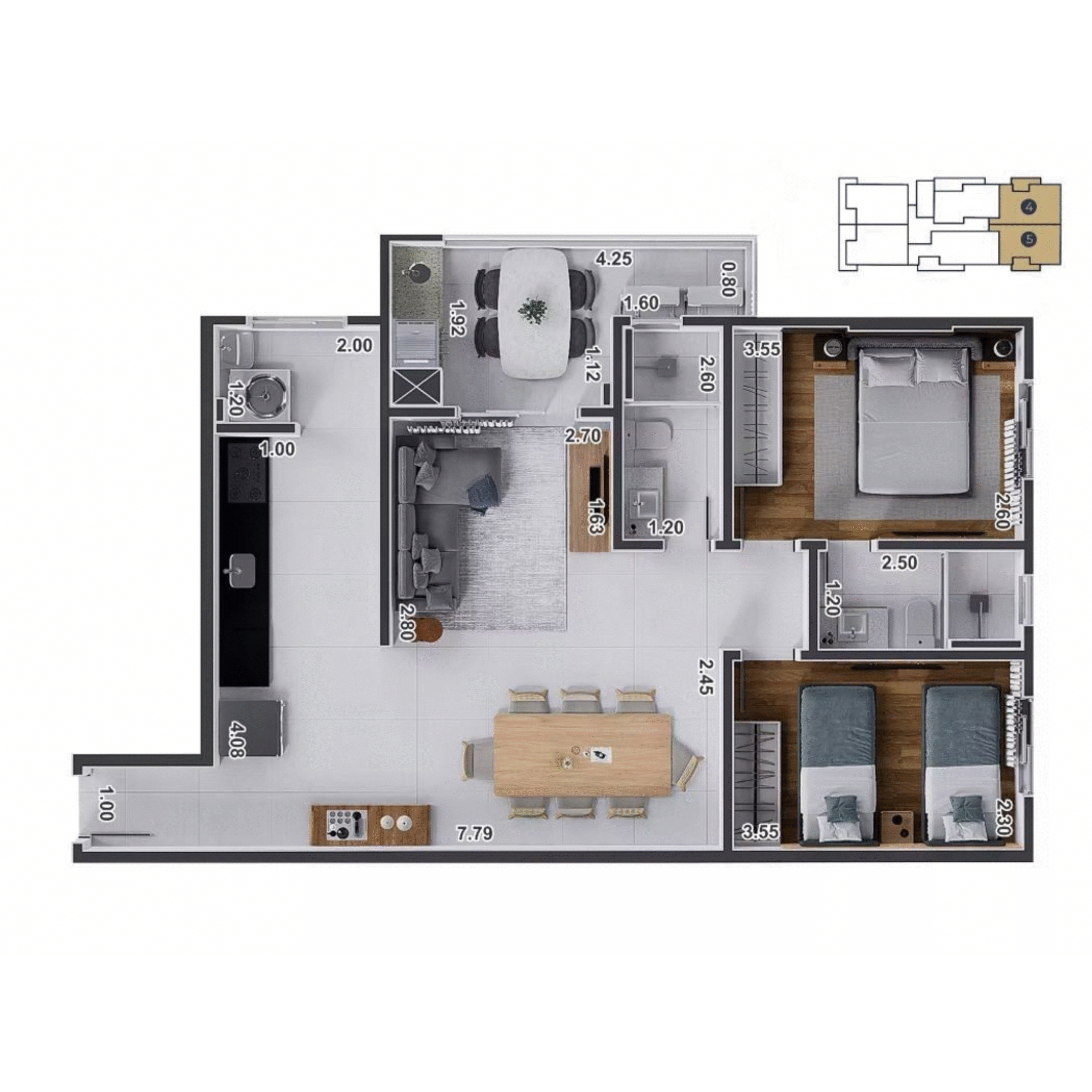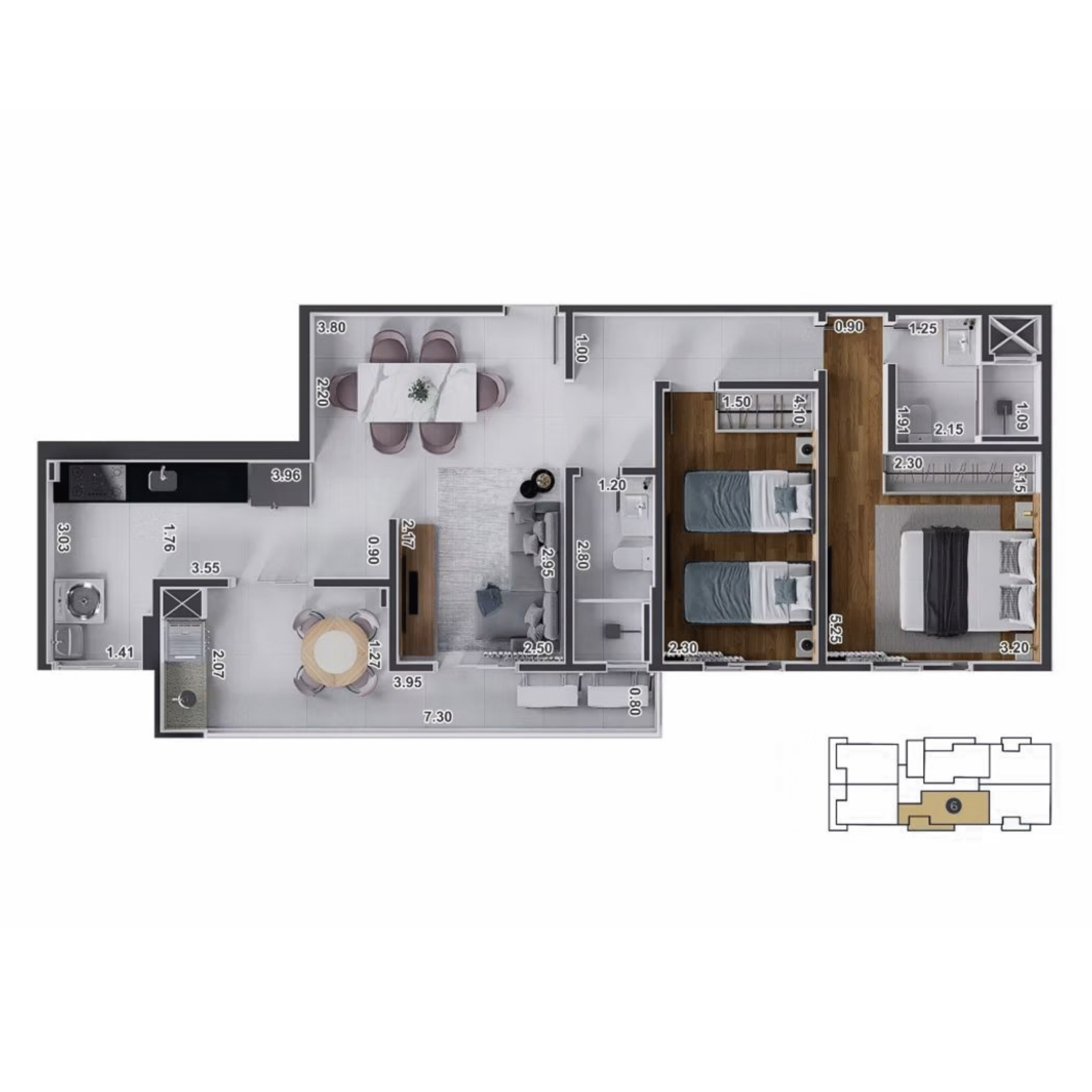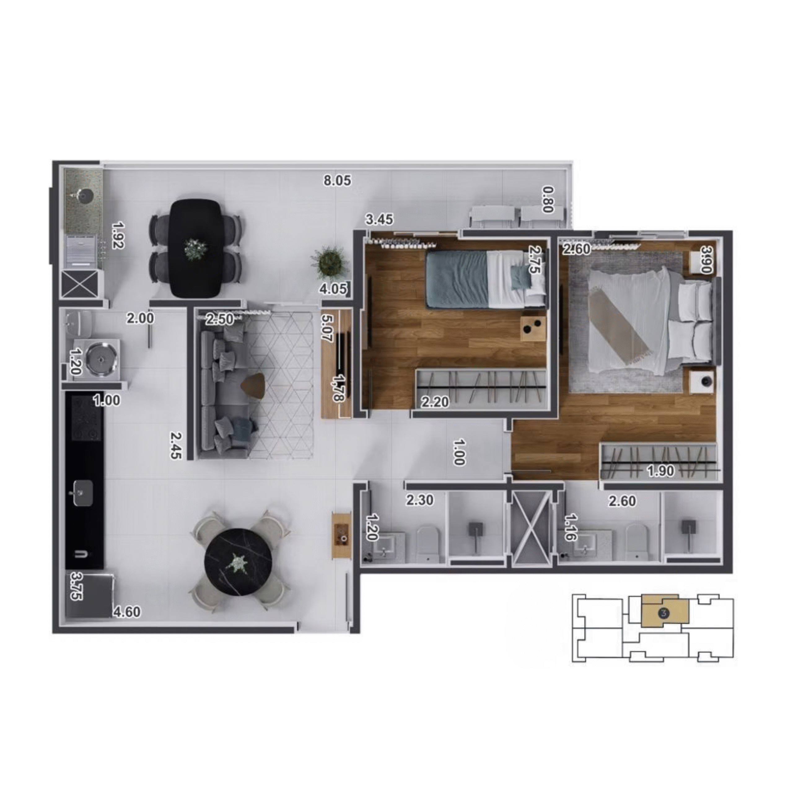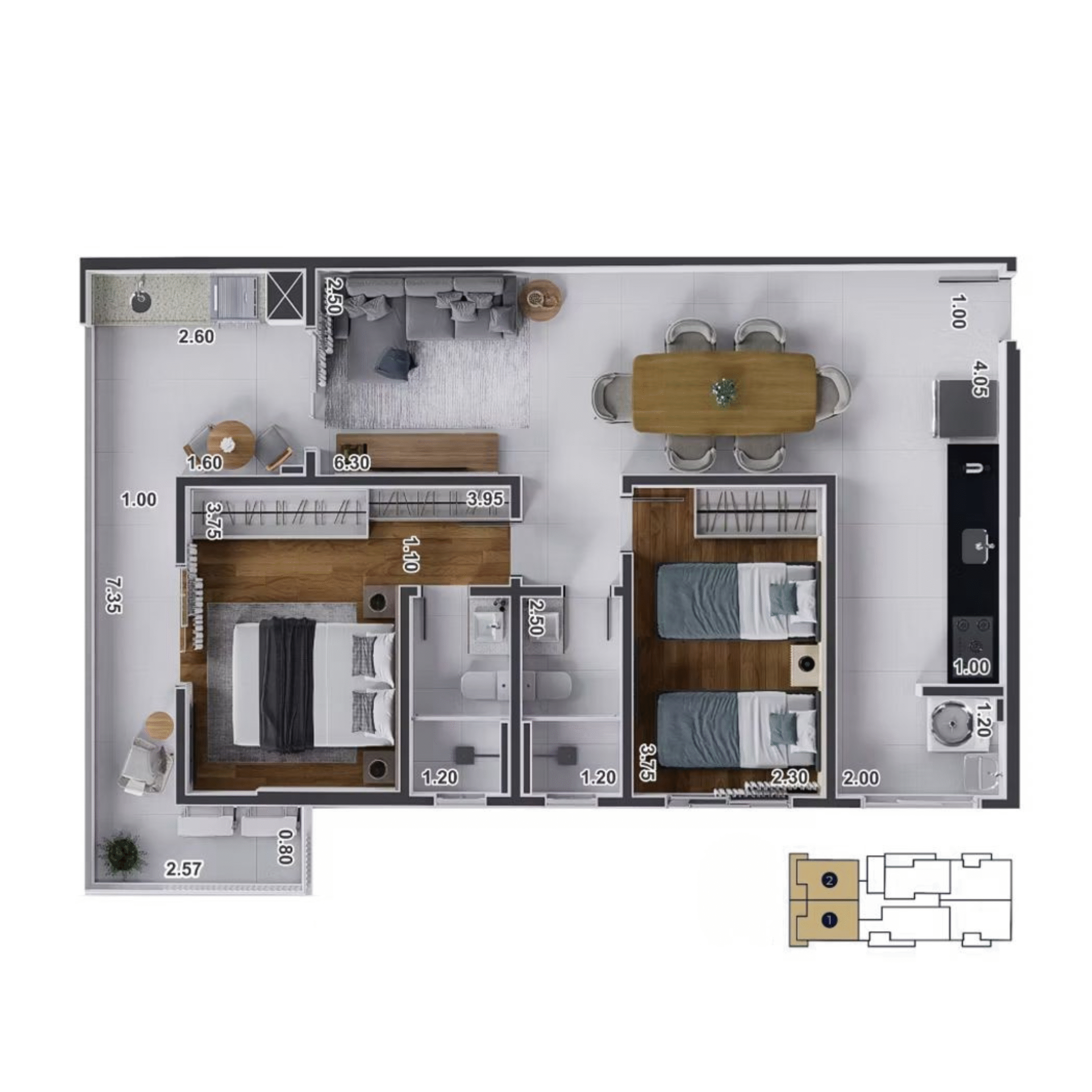 Apartamentos de 2 dormitórios, de 71 a 82 m², com churrasqueira a carvão na varanda, 1 e 2 vagas de garagem.