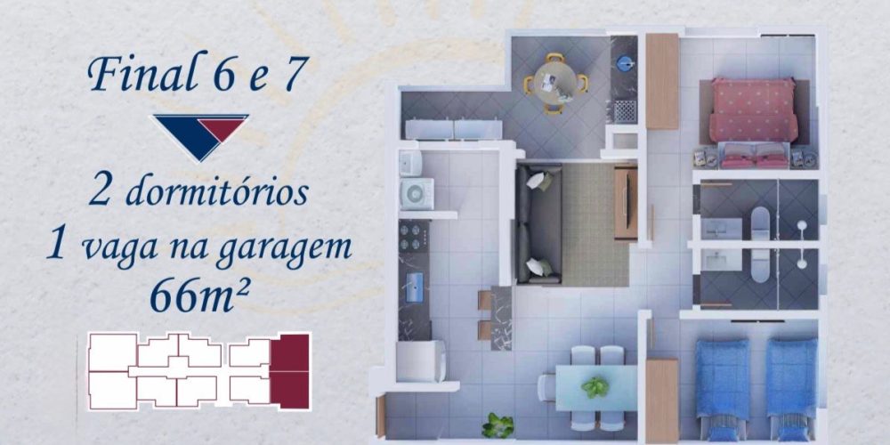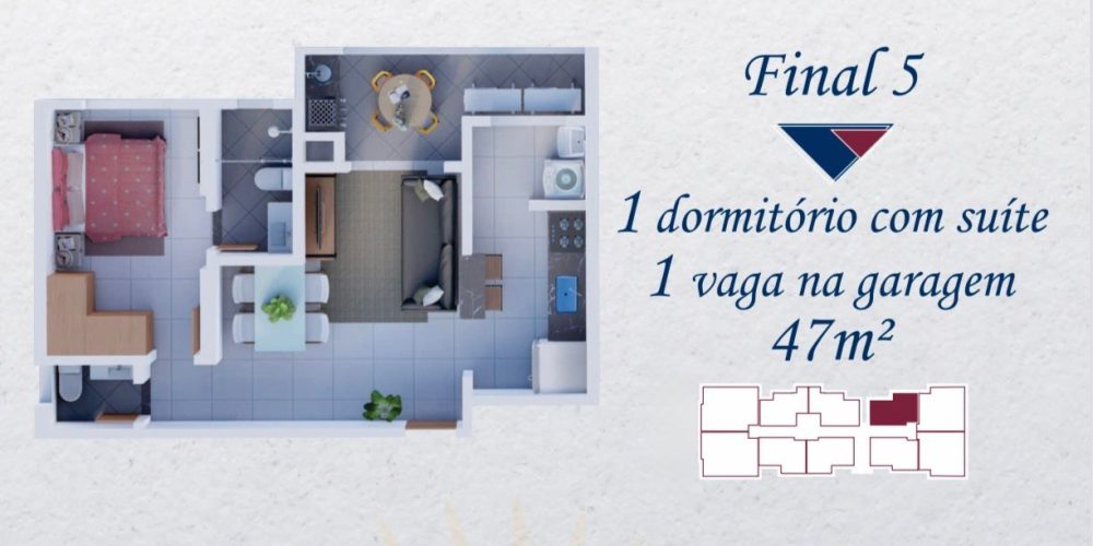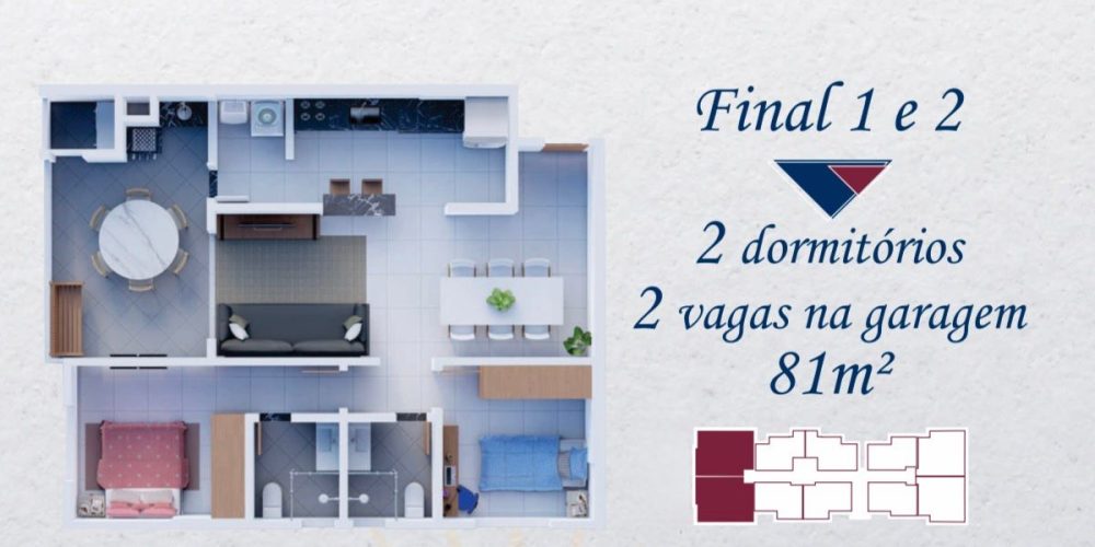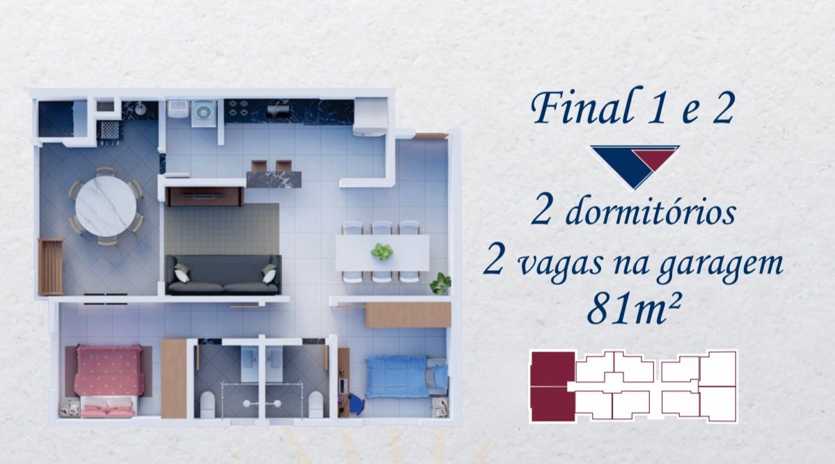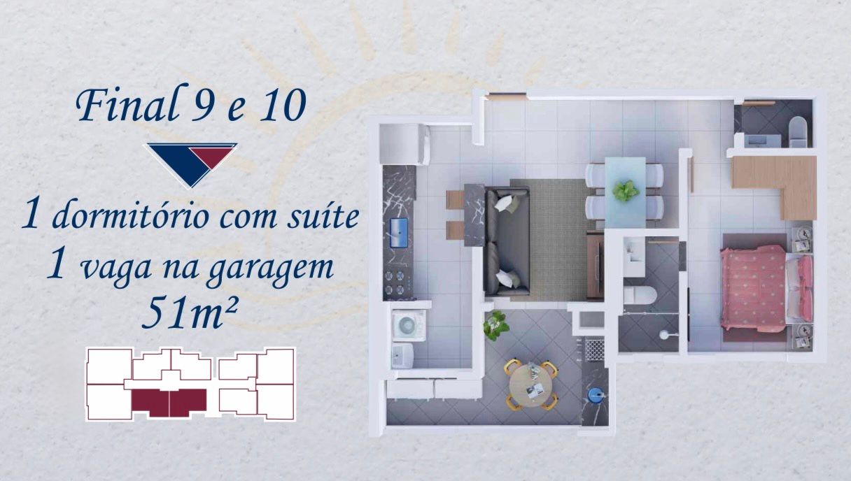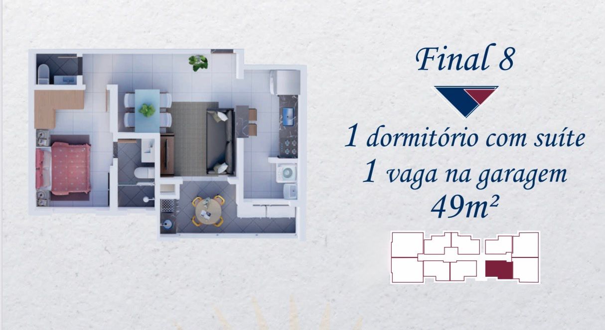 Apartamentos de 1 e 2 dormitórios, de 47 a 81 m², varanda com churrasqueira a carvão, 1 e 2 vagas de garagem.