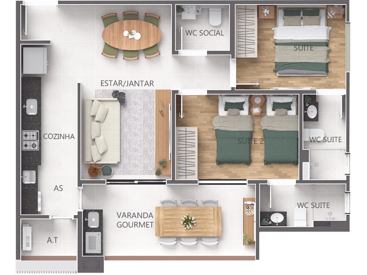 Apartamentos de 1 e 2 dormitórios, de 51 a 75 m², 1 e 2 vagas de garagem.