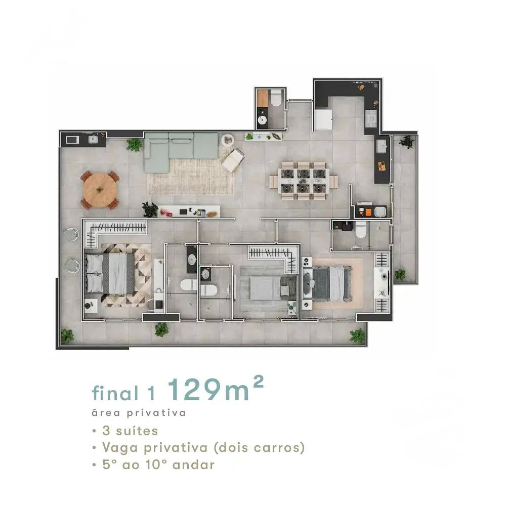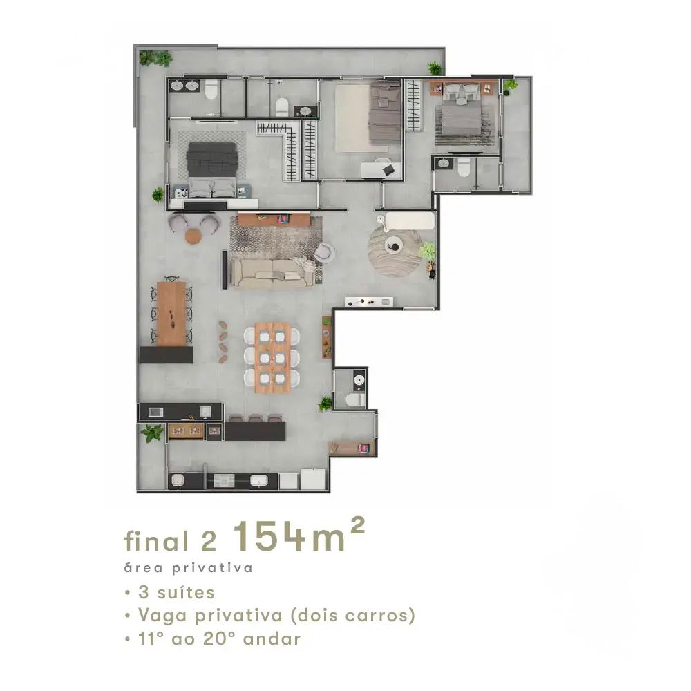 Apartamentos de 3 dormitórios, de 124 a 154 m², com 2 vagas de garagem privativas.
