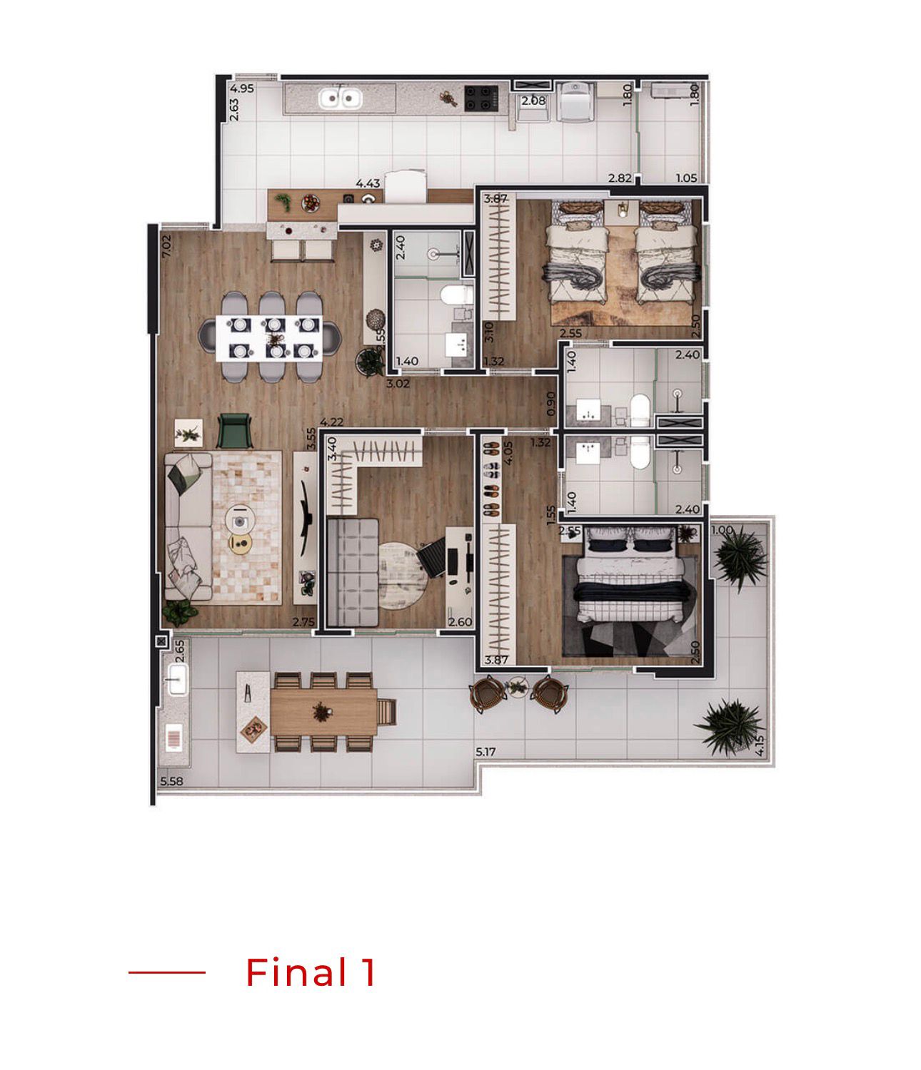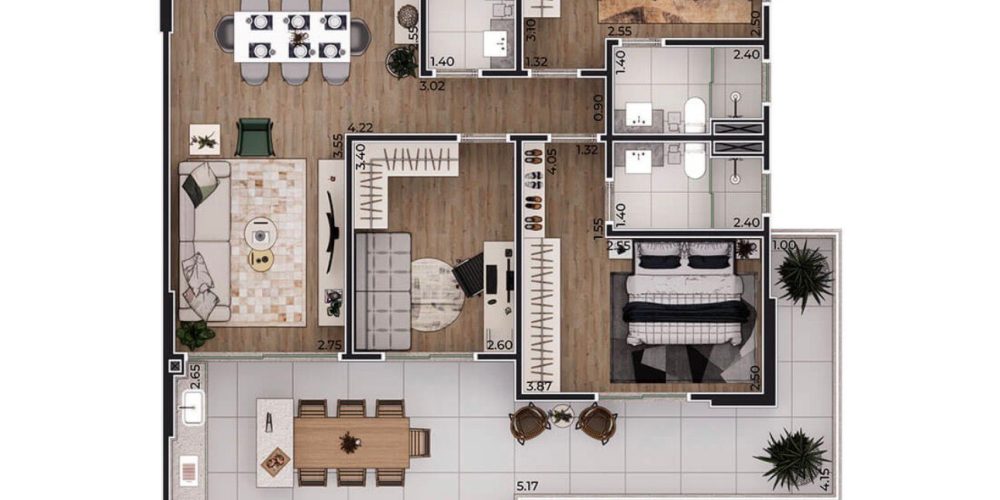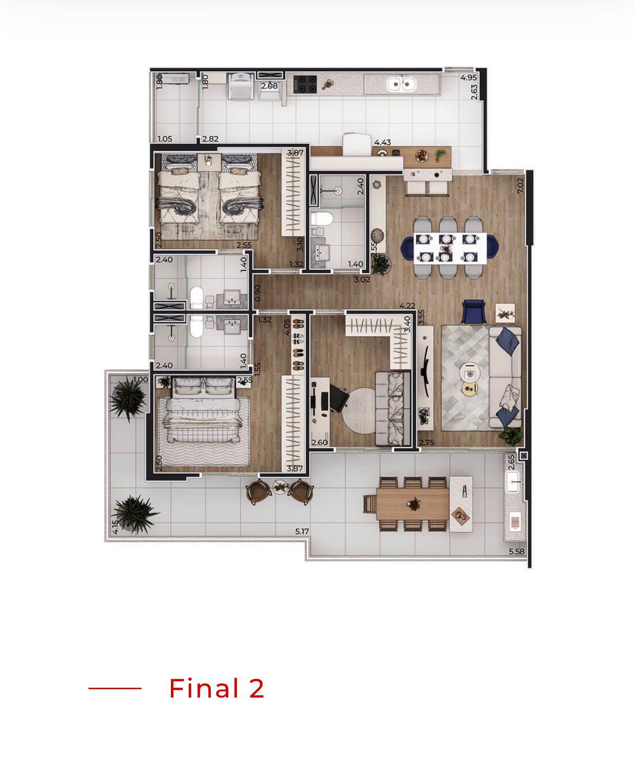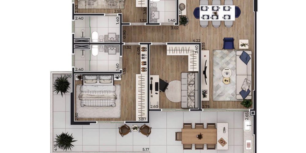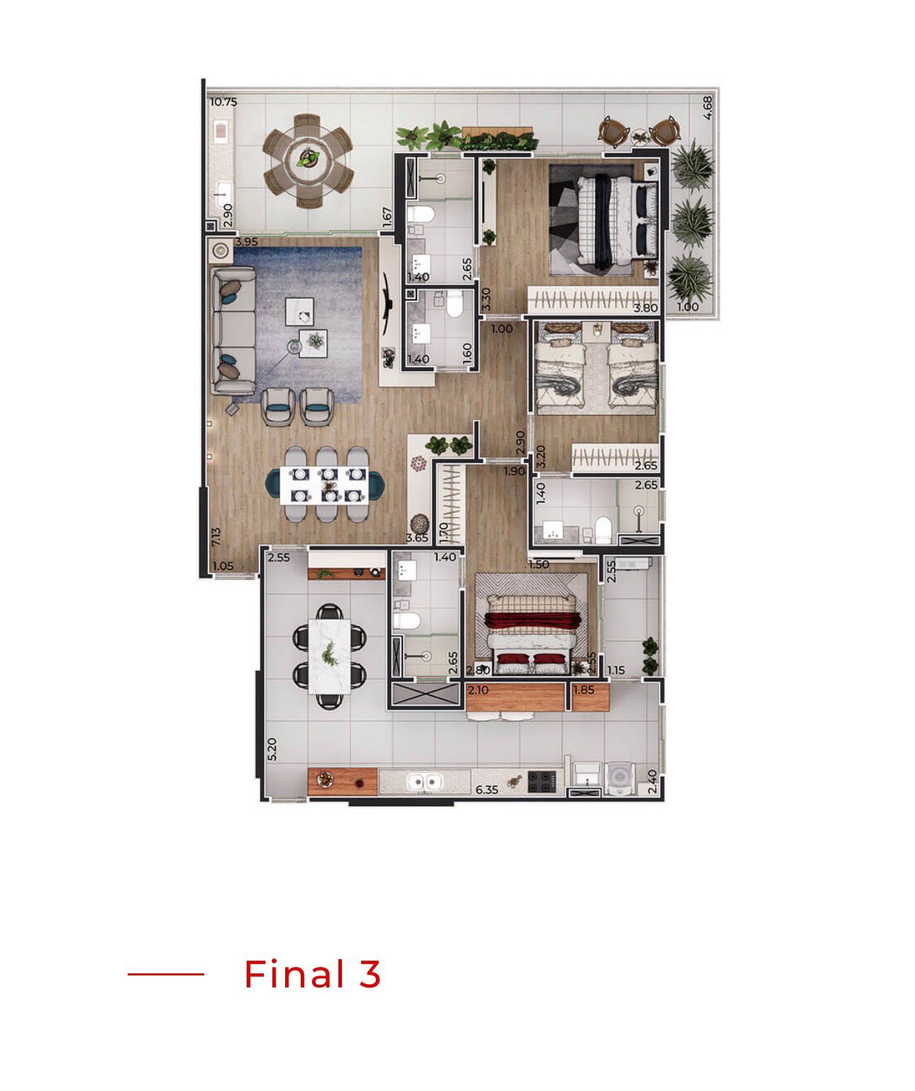 Apartamentos de 3 dormitórios, de 125 a 149 m², com 2 vagas de garagem.