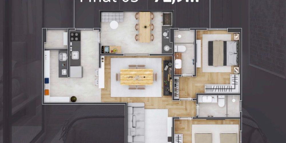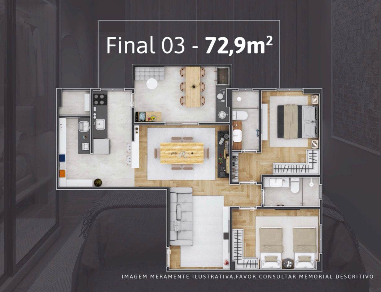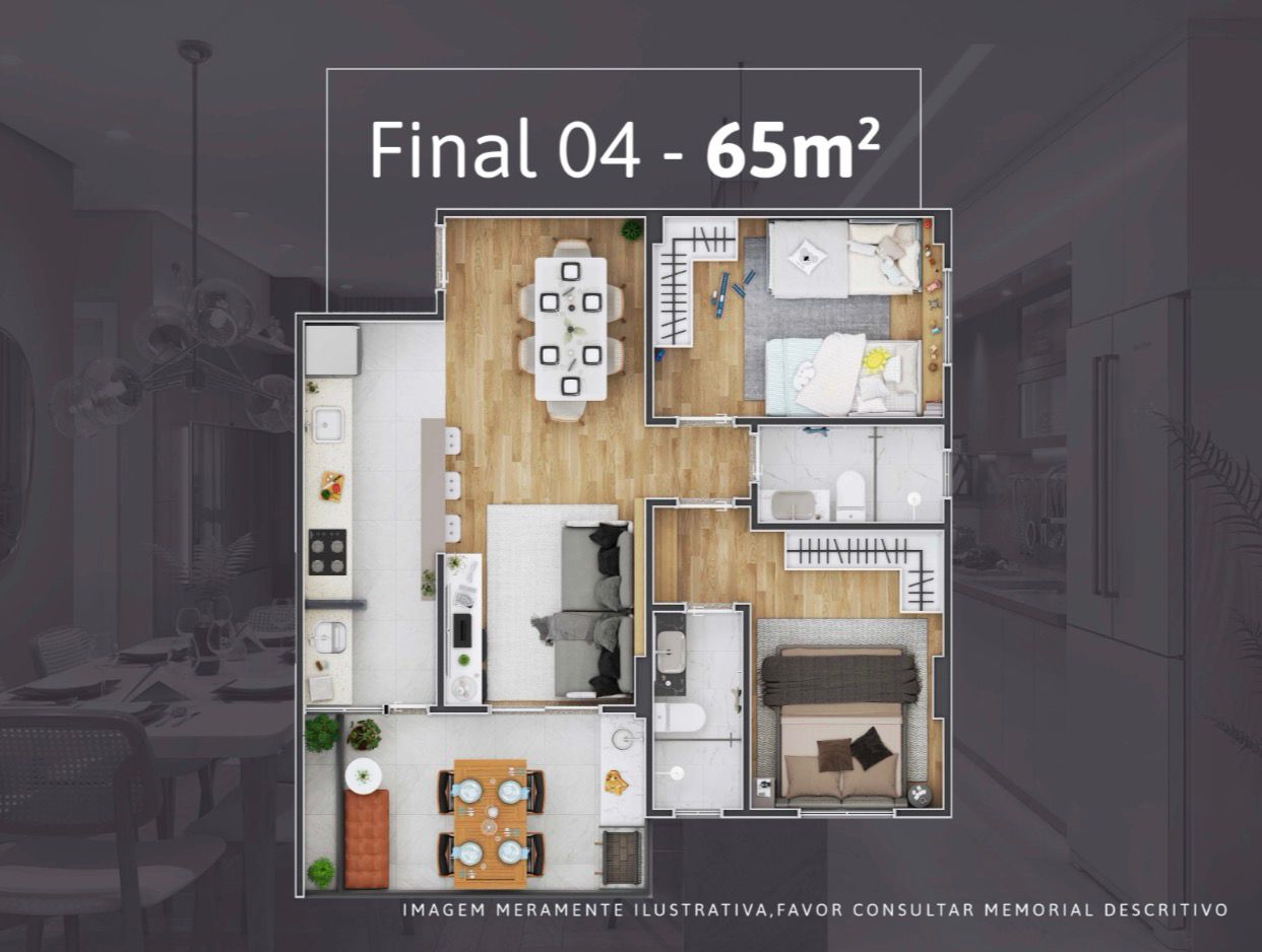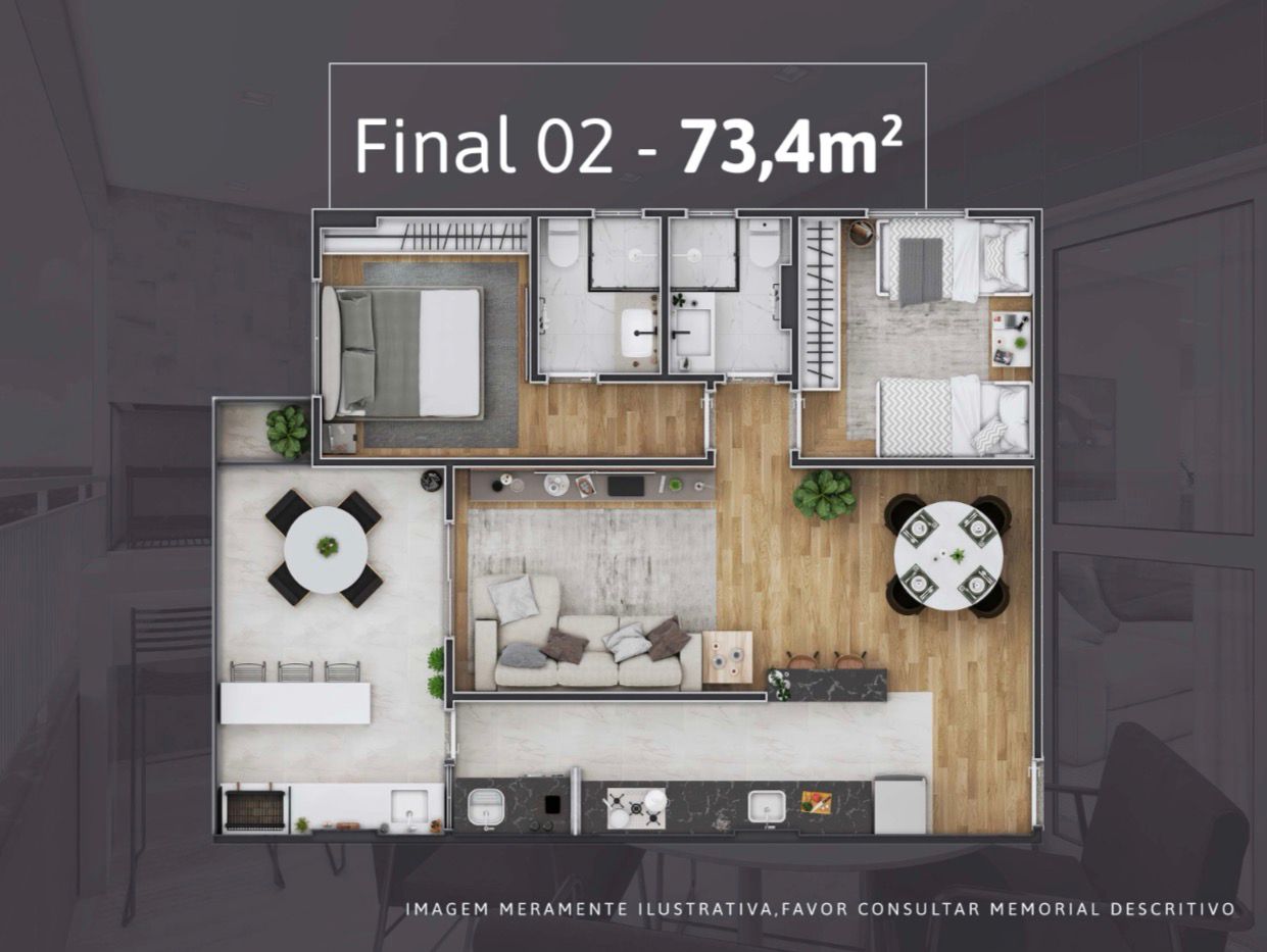 Apartamentos de 2 dormitórios, de 65 a 73 m², com 1 ou 2 vagas de garagem.