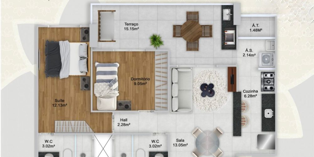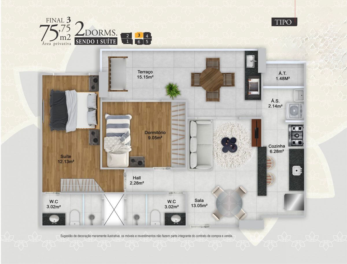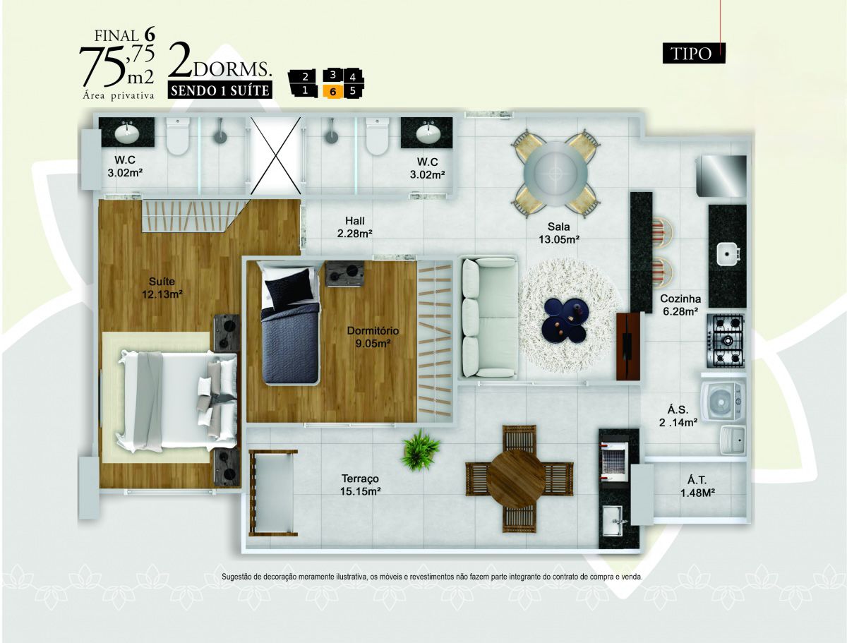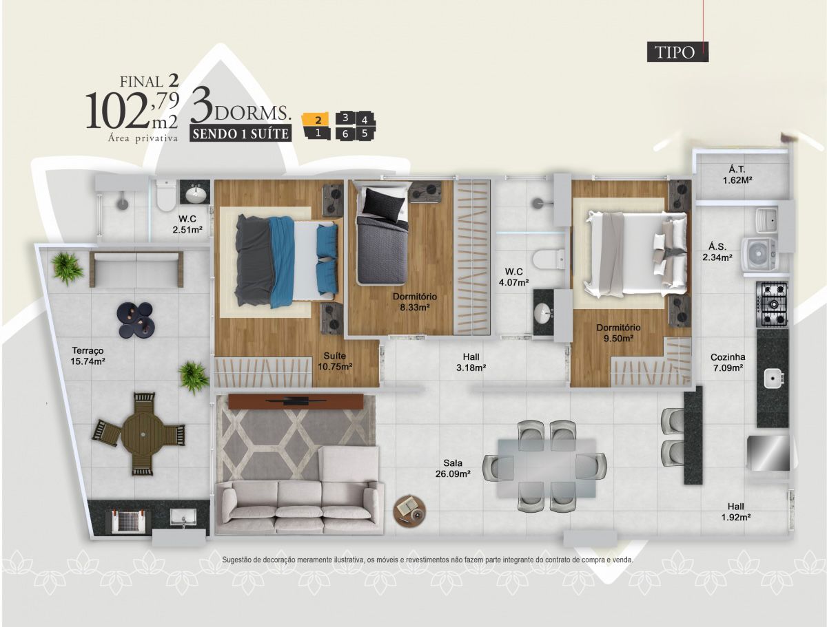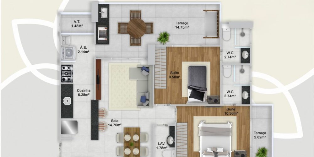 Apartamentos de 2 e 3 dormitórios, de 76 a 103 m², com 1 ou 2 vagas de garagem.