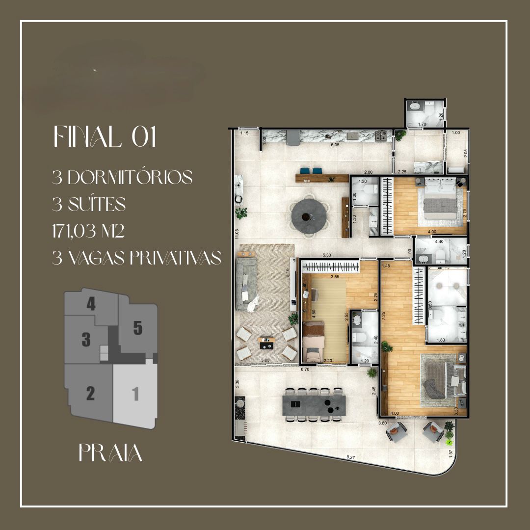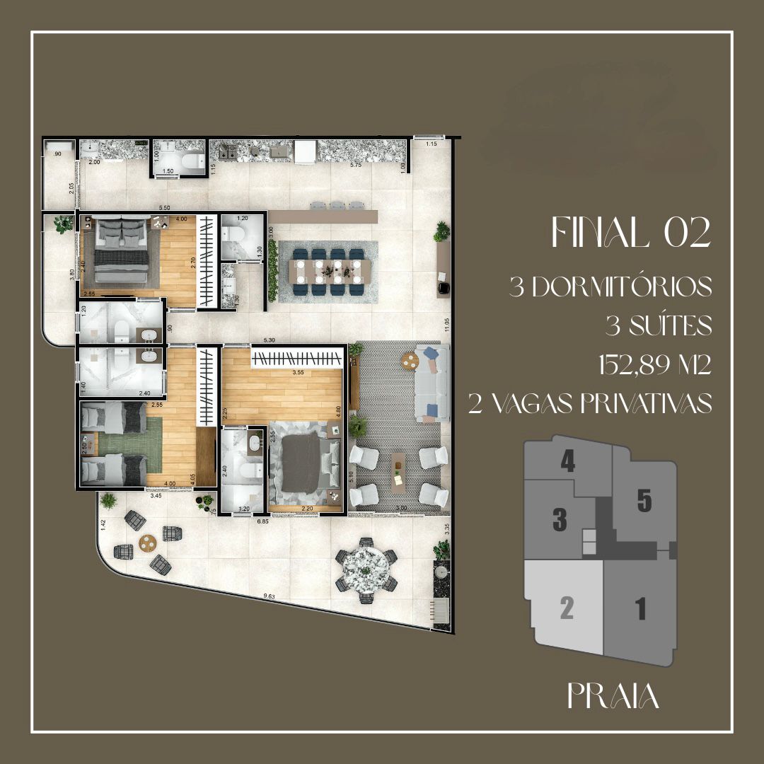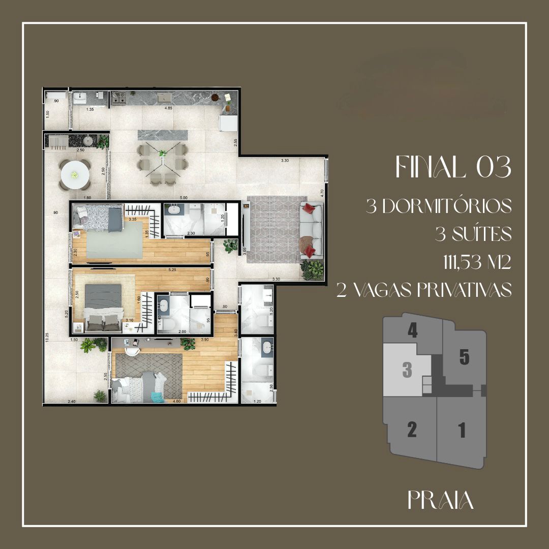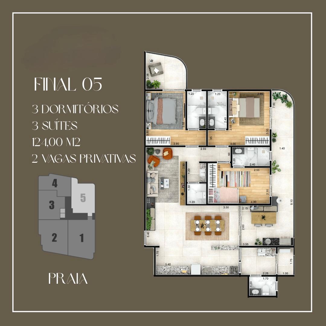 Apartamentos Frente Mar de 2 e 3 dormitórios, de 93 a 171 m², com 2 ou 3 vagas de garagem.